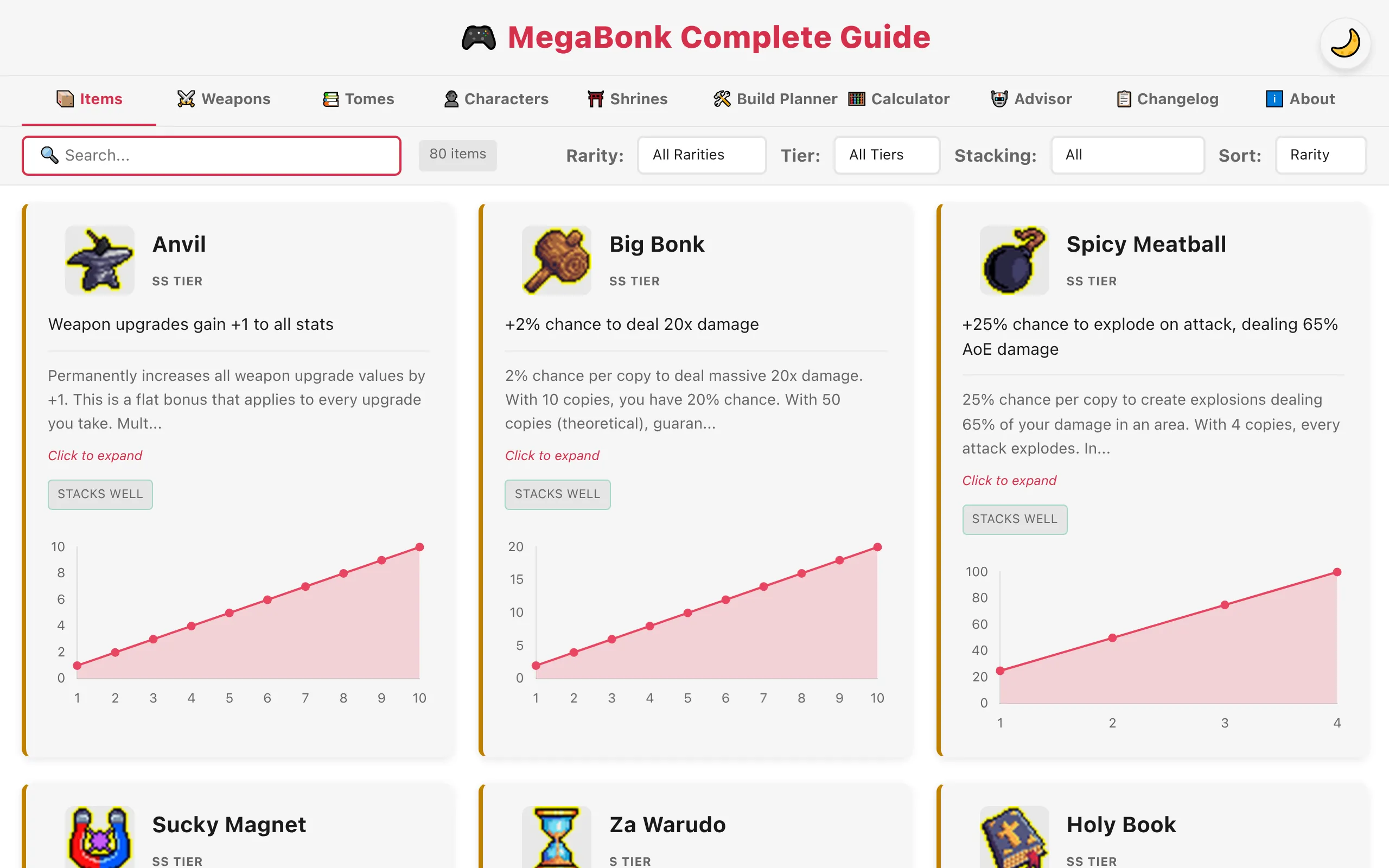 The ultimate reference guide for MegaBonk — items, weapons, tomes, characters, shrines, build planner, and breakpoint calculator in one interactive web app.